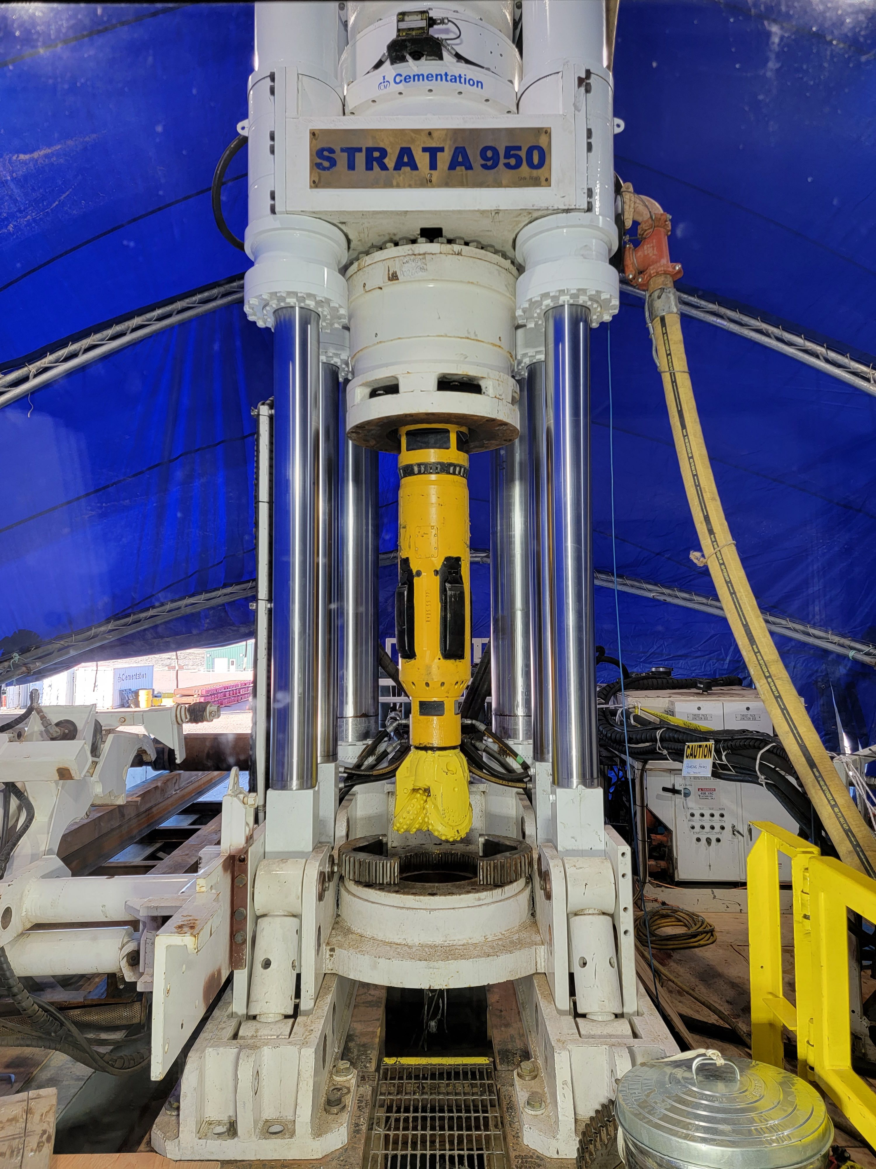 Après l’achèvement de l’excavation et du revêtement du collier de 68 pieds de profondeur, la foreuse à élévation Strata 950 de Cementationa été installée au-dessus du collier et un trou pilote de 16 pouces de diamètre a été foré à l’aide du système de forage vertical rotatif (RVDS) de Micon. When the completed pilot hole was surveyed, the total deviation from vertical was found to be less than 4 inches over entire length of pilot hole.